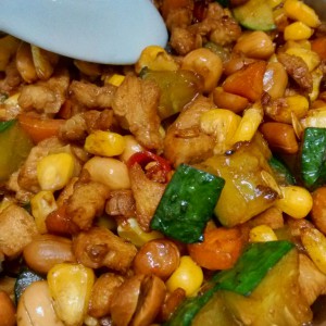 热油炒鸡肉丁,肉变白加玉米粒,胡萝卜丁,黄瓜丁,翻炒几圈加酱油,白砂糖适量,盐少许,味精,翻炒均匀,出锅前倒入花生米,翻匀,搞定啦