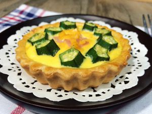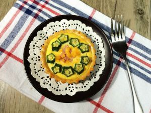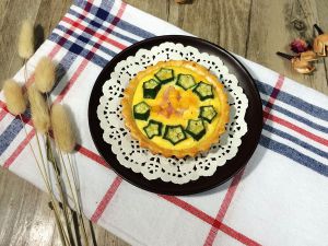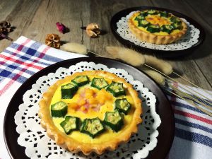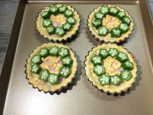 摆上秋葵(可摆出各自喜欢的造型),再放入余下的牛奶蛋液和奶酪。