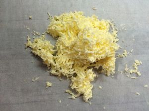 从冷冻室里取出的黄油用刨屑刀刮成屑。(这一步一定要用冷冻的黄油刮屑,才能更好地和粉类充分混合,这样的派皮才会酥松)。