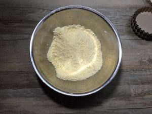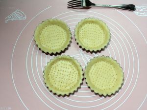 取出面团,用擀面杖擀成约3MM厚度、比挞盘稍大一圈的面皮,覆盖在派上用手按压盘边成型,轻轻用手按压使挞皮和挞盘帖合。派底用叉子扎小孔后,装入保鲜袋继续放冰箱冷藏松弛30分钟。