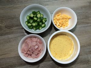 牛奶加鸡蛋,适量盐,胡椒粉拌匀。火腿片切成小片状,切达奶酪切成小碎丁。秋葵先沸水中焯过捞起(水中加2克小苏打以保持秋葵的绿色),擦干水份,切厚片。