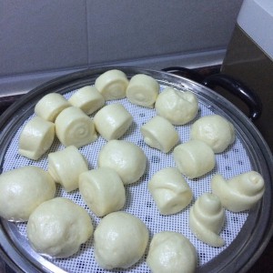 大概称50g面粉,一点点的放入面团,一边排气一边加,直到面粉不粘手,有弹性,做形状,放入蒸锅,冷水发酵至两倍大,或者20分钟,中火蒸25分钟,然后过5分钟再开盖。超级无敌的的奶香