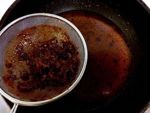 水开后过滤掉葱、姜、豆瓣等料头,汤汁加入泡发香菇水,放香菇丁大火烧开,中火熬制