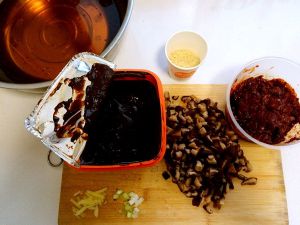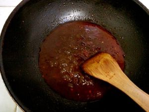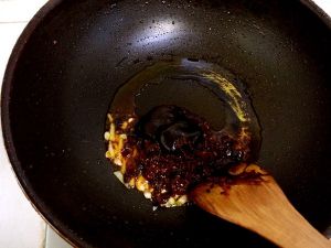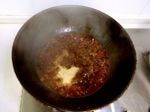 锅内余油放入3勺豆瓣酱,半勺豆䜴,1勺半甜面酱,葱、姜炒匀