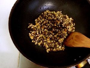 锅底油5成热倒入香菇丁煸炒至表面硬,炒出香菇香味捞出