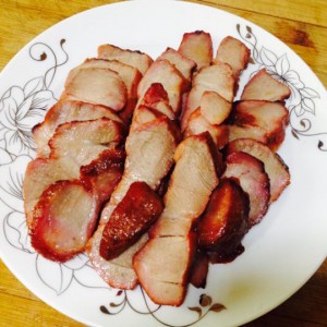 开烤。烤箱200度预热10分钟。烤盘垫锡纸,肉夹出来放烤网上。再配个刷料:腌肉汁1勺,蜂蜜1勺,油1勺,拌匀。肉的每一面都要刷到,烤出来的肉更有焦香味,放烤箱上层烤10分钟,然后拿出,再刷一遍料汁,翻面再烤10分钟就可以了。烤好的肉放凉后切片装盘。