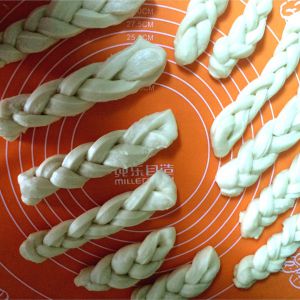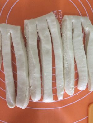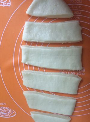 发好的面团分成两份,分别擀成椭圆形,切成六等份.