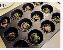将混好的鸡蛋液均匀的分至麦芬模具中。