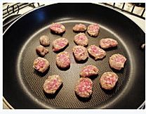 麦芬烤盘喷上一层油,加入香肠和韭葱。