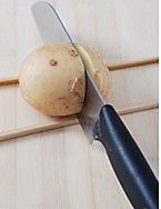 土豆洗净,切成0.5cm的片,底部不要切断。切的时候可把底部垫两支筷子,