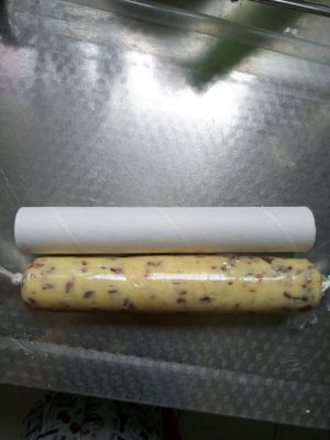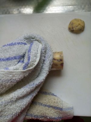如果家里有用完得保鲜膜,保鲜袋得纸芯就更好了,可以旋转着塞进去,但是记得塞以前把一头系住,要不会旋转出来面团的