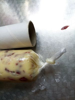 没有纸卷的,系好一个头,然后另一个头旋转旋转旋转,把保鲜膜里面挤满,不要留空隙,用手按下手感结实,然后放冷冻室一个小时