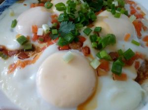 在表面撒上少许酱油,葱花,香菜。下面是肉上面是蛋,特别好吃。