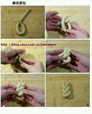 把小面团按扁,排气,搓成大约45㎝长的细长条,做成麻花型(如图,来自君之)。然后进行二次发酵(45分钟就发酵至两倍大了)。