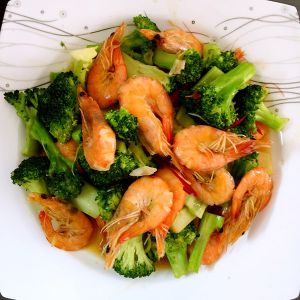 锅里放比平时炒菜多一点的油,炒虾,虾变白了之后,放葱姜,西兰花