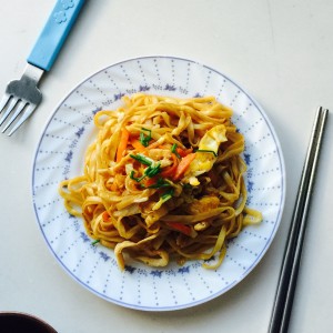 所有配菜下锅炒,半熟后下面条,放料酒(增香)酱油(上色),用筷子划炒,微焦出锅!