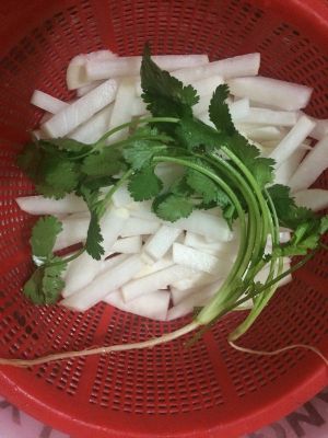 倒入料酒和生抽,接着加入开水再倒入白萝卜 。