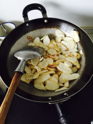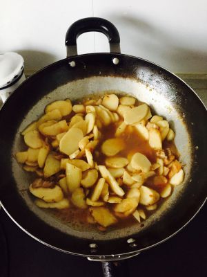 2、锅里放五花肉,净炒出油,看五花肉变色就倒山药快速的翻炒,➕盐炒炒到粘锅加半碗的水炒,炒到又粘锅马上➕糖➕酱油➕一点点老酒➕鸡精继续炒