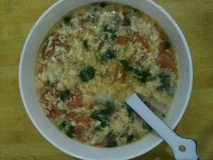 水开后,倒入蛋液,用勺子搅几下,放入盐,糖,鸡精。煮一分钟,然后倒入切好的香菜,出锅。