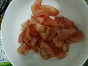 西红柿切滚刀,下蒜后,马上下西红柿,翻炒,炒到西红柿块变烂,倒入适量水