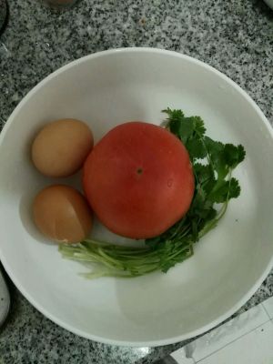 准备食材,西红柿大个一个,小个2个,鸡蛋两个,香菜一小把