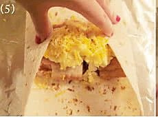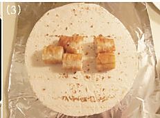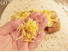 在饼皮的中间放上油条,培根和鸡蛋,撒上适量的cheddar芝士。