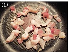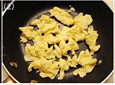 平底锅中留有培根油,加入打散的鸡蛋,炒好备用。