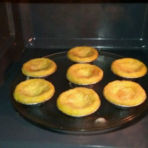 调好的蛋挞液倒入蛋挞皮中,八分满,放入微波炉。