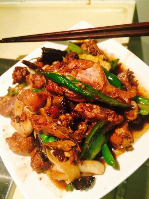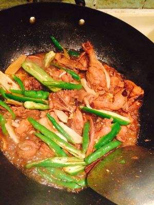 焖到汁不多时在放人切好的我青椒姜片翻炒,加盐与鸭肉一起炒,入味后,加点味精也可,放葱结,出锅。