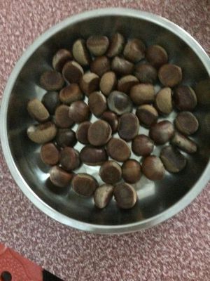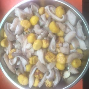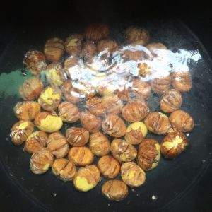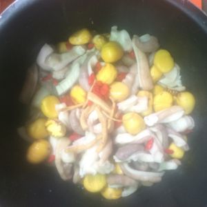 炒到猪肚不再有水分时放入剥好的水灵灵的板栗君。下适量盐巴。炒呀炒。炒到盐巴差不多均匀的样子。