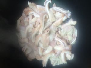 回到猪肚。切好的猪肚下锅炒。把多余的水分炒干。一定要炒干!一定要炒干!!一定要炒干!!!重要的事要说三遍!