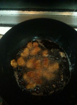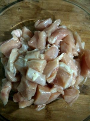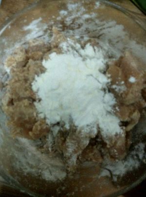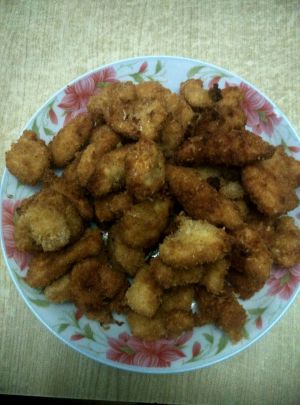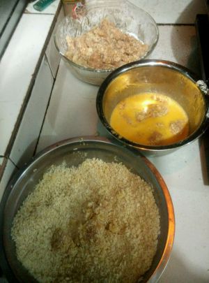 把裹好淀粉的鸡肉放在鸡蛋液里裹一下然后放进面包糠里裹一下。