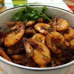 倒入炸好的虾。爆炒几下,倒入调好的酱料。翻炒一会。加一点点水,此时加入生抽,盐,胡椒粉,糖。大火翻炒,最后加入香菜,起锅!