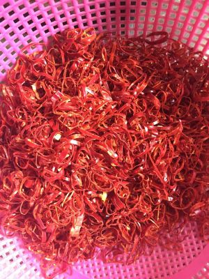 1.材料准备好,瘦肉切成小块,干辣椒用剪刀剪成小条