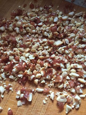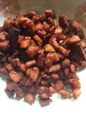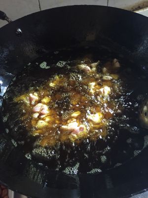 3.开火,用炒花生米的油炒肉!并放入八角。用中火,也是不停的翻炒,当肉炒干,并变成枣红色,起锅备用