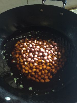 2.冷锅倒入油,并倒入花生米,开中火,不停得翻炒花生米,当听到“碰碰”声时需要注意翻炒时间,翻炒中如没有“碰碰”声了,需要及时关火,把花生米盛出,以免花生米糊掉!超好的花生米用盘盛放,放在通风地方冷却,这样花生米会更酥脆!