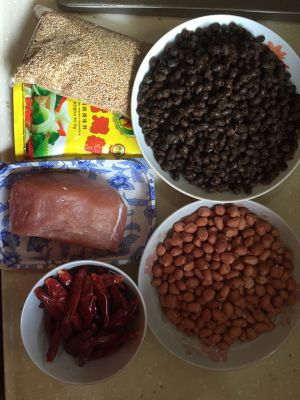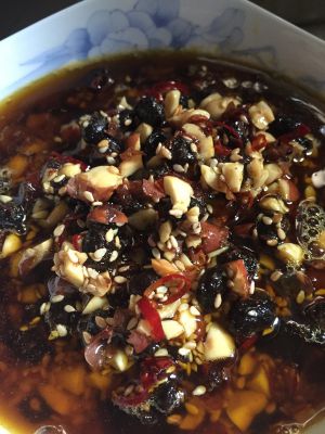 5.放入豆豉,中火翻炒看到油冒小气泡时,放入辣椒,花生,白芝麻,鸡精!并翻炒至香味出来关火!