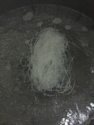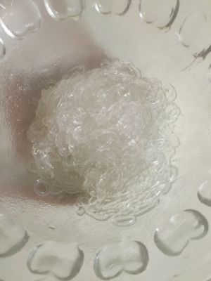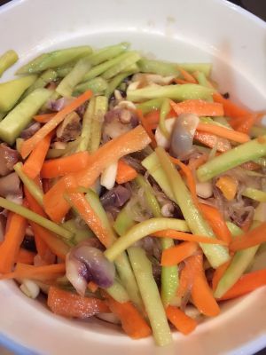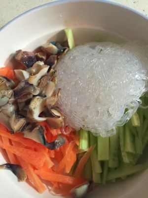 黄瓜、胡萝卜切丝(忽略我的刀功)海螺肉切片。倒入焯好的粉丝。