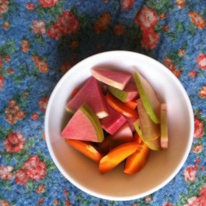 把所有的材料全部放入干净的盆中,放入凉开水,水要没过泡菜,放入适量白醋、盐、花椒,盖上保鲜膜,放置一晚就可以使用