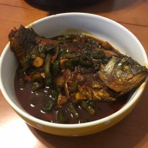 炒出红油后把煎好的鱼放进锅里