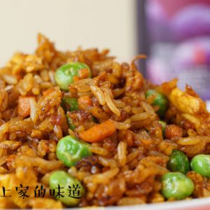 放入胡萝卜丁和豌豆炒熟,加入米饭并炒散