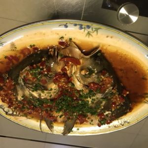 鱼头蒸十分钟后,关火闷两分钟取出,用炒锅将油烧热后淋至鱼头,撒上葱花,大功告成。