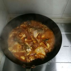 加水,火锅底料,熬制一会儿,加入杏鲍菇,豆皮,放入鱼。大火炖20分钟。大火收汁。
