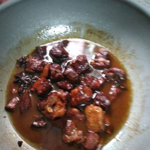倒入适量的油,小火加热后放冰糖使冰糖熔化后发黄冒泡后加入排骨翻炒,再加姜片和大蒜子翻炒,再加八角、酱油、适量的盐翻炒,再加热水,水盖过排骨多点点,大火烧开5分钟,再用小火煮一个小时左右,出锅,如油多了可捞出排骨,再加入适当的汁就可吃入最好再加点香莱更味美香甜了!