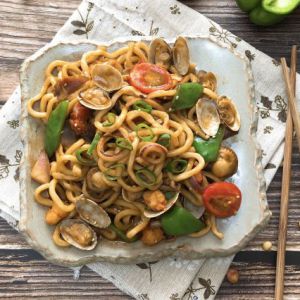 把洗净切好的小海鲜放进去,加入适量的黑胡椒粉一起翻炒,等蛤蜊开口,说明熟了