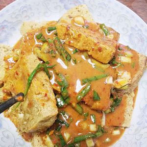 用三块王致和臭豆腐用勺子捣碎,加少于的温水稀释,放入切好的豆腐进行腌制,用保鲜膜裹起来,因为味道太丑,腌制半个小时就可以又炸了,