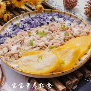 准备食材:紫甘蓝1片,猪肉60克,大米50克,红薯40克。
