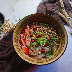 将煮好的粉盛入调好料的碗中,加入适量的汤,撒上炸好的花生米、黄豆和葱花,拌匀即可食用。