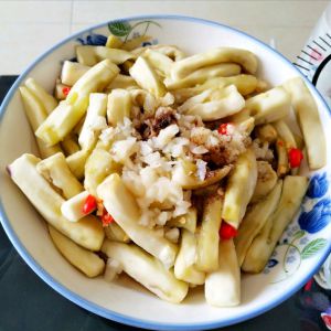 嫩茄子洗净去皮,切成长条(稍大一点,太小蒸后搅拌调味剂容易成碎沫),小米辣小切丁,新鲜大蒜切碎沫备用。