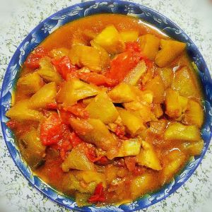 3.锅中的油,放入葱姜蒜,豆瓣酱,把豆瓣酱烧出红油!然后把西红柿切好的放入,来回翻炒加一点水炒,然后把扁软的茄子放入接着炒,然后把调好的小半碗水调料放入,来回翻炒!收汁!就可以出锅了!